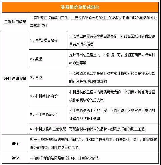 1)看施工項目是否全面,是否漏掉防水、頂面膩子或其他必要項目,避免后期業(yè)主迫于無奈增加這項施工的開支,超出預算。