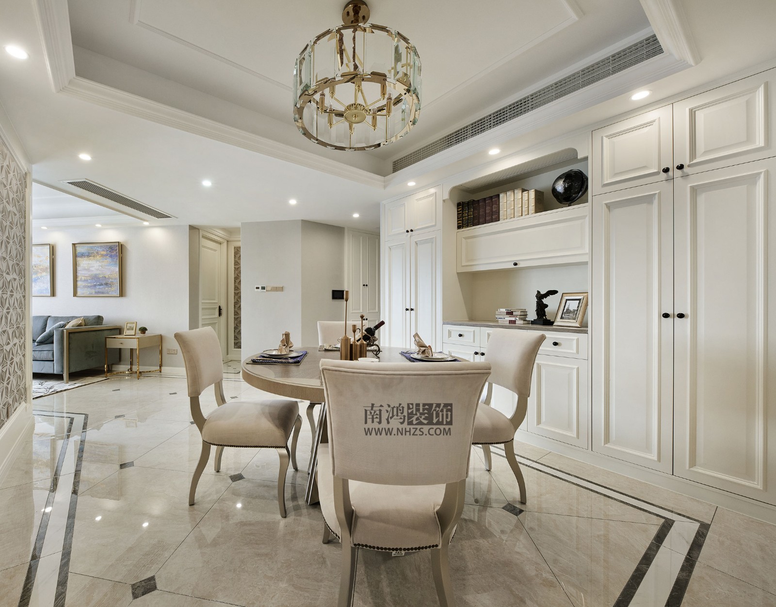 客廳主色調為米白色,帶有輕奢意味的金屬元素鑲嵌在其中,于總體柔美舒緩的氛圍中透出一股低調的精致。