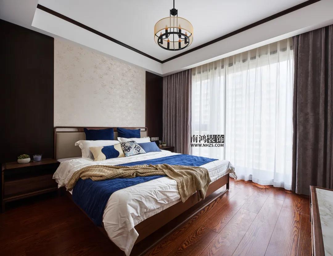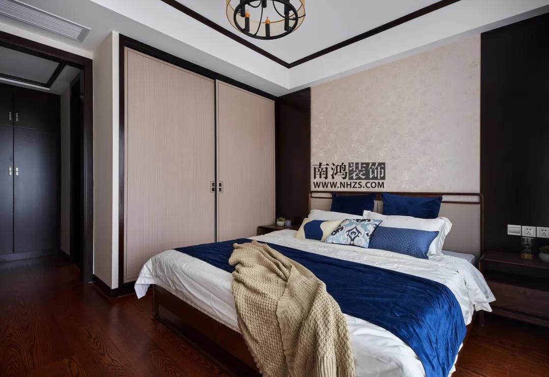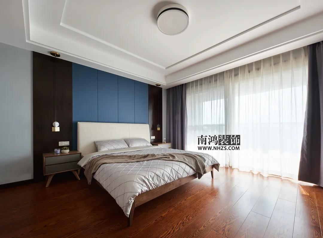 主臥背景選用亞麻色的印花墻紙,亞麻色比白色溫暖,比黃色低調(diào),搭配任何顏色都不會突兀。床品點綴深藍,鮮活視覺。