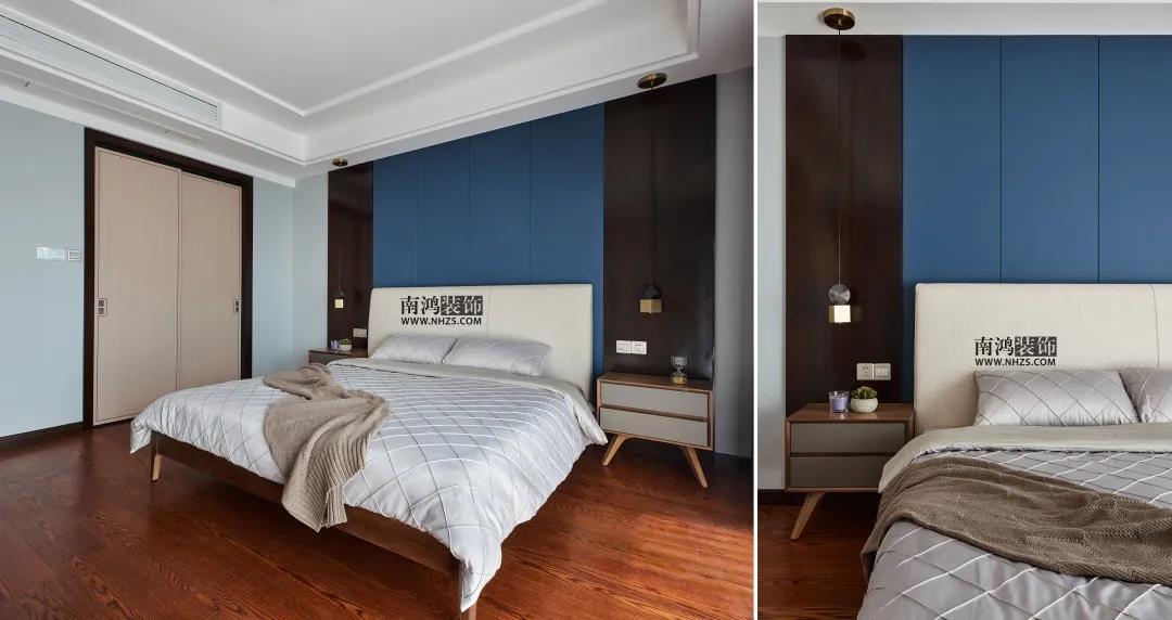 業(yè)主大兒子的房間,應居住者需求,淡化了中式元素而更偏向現(xiàn)代風格。雙層折邊吊頂簡潔大氣,床頭背景墻選用藍色硬包結合木飾面,床頭柜上方設計了金屬色吊燈點綴空間。