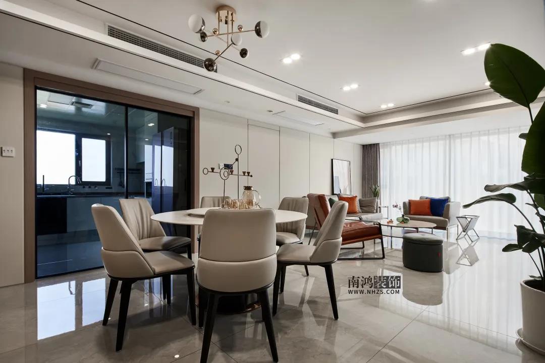 項目信息 地址 / 五幸家園 戶型 / 四室兩廳 面積 / 146㎡ 風格 / 現代輕奢 設計施工 / 浙江南鴻裝飾 ▽原戶型優劣勢 Ⅰ優勢:有大陽臺,采光充足;房屋布局比較合理,動靜分區。 Ⅱ劣勢:廚房面積太小;主衛是暗衛;沒有足夠的儲物空間。 ▽優化改動 1、針對公空間區域,擴大廚房面積,更改書房進門方向,并打通客廳與陽臺,使客餐廚幾塊區域的空間利用更加合理。 2、長輩房利用外機位的位置,與兒童房相連的墻體改動,增加了兩組儲物柜。 3、移動兒童房墻體,主臥得以增加了一個衣帽間。主衛門改變朝向,擴大使用面積。 在分析了戶型、了解了客戶需求和喜好的基礎上,設計師用了大面積的灰調和白色等中性色作為基礎色,用跳脫的橘色和綠色作為點綴,烘托空間的精致氛圍感。 木色、米色、灰色加局部亮色點綴,突出質感的同時又能很好的融合家庭溫馨的感覺,符合業主的低調輕奢上檔次的預期。 由于家里常住人口較多,因此在收納上也下足了功夫。同時巧妙應用了大理石、巖板、木格柵飾面,絨面、金屬等材質,別具一格的軟裝細節和色彩變化,既滿足了一家對居住體感的舒適度需求,又創造出不拘一格的視覺盛宴。 客 廳 客廳納入陽臺,擴大使用面積并增加采光。溫和的米白色主調搭配輕奢系軟裝布置,讓視覺無比明朗舒適。 客廳與陽臺打掉的隔墻上有一道很低的梁,我們并沒有將兩側背景墻直接做到吊頂底部,而是選擇留出一截高度,這樣既能弱化梁位又不會犧牲層高。 硬朗的大理石與皮藝、絨布材質結合,提升客廳的細節質感,軟裝上點綴跳色,讓空間不致單調。 客餐相鄰,通往書房的地方做隱形門處理,整體背景墻效果得到統一,視覺延伸感極好。 餐 廳 △裝修前 △裝修后 餐廳,高顏值的白色巖板餐桌用來搭載美味料理,皮質餐椅柔和可親,精致的金屬元素則貫穿始終。 餐廚之間以玻璃移門隔絕油煙,背景墻定制餐邊柜分擔收納功能,簡約時尚的用餐環境圍塑出最幸福的人間煙火。 廚 房 廚房經過調整后面積擴大,黑白灰三色比例完美協調,黑色巖板臺面厚薄適中,易于打理,白色的無把手柜門則讓視覺的純凈感達到極致。 臥 室 △裝修前 △裝修后 主臥延續優雅的輕奢格調,皮藝硬包背景與床體適配和諧,空間語言以它獨有的方式巧妙傳達著愜意的延伸。 主衛朝向睡眠區的墻面做了一塊電子霧化玻璃,借此改善內部采光。 △裝修前 △裝修后 長輩房,整體搭配簡約大方,儲物柜門做凹槽,無把手設計更顯空間整潔。 長長的飄窗作為平日里的休閑一角~ 男孩房,藍色系床品搭配留白的灰色背景,安穩中又透著活力童趣,靠近陽臺一側規劃出孩子的學習區域。 書 房 書房一角,滿滿的柜子提供豐富的收納空間,明黃色小沙發搭配色彩豐富的地毯,這兒想必也是孩子最愛的活動場所。 衛 生 間 主衛,墻地面通鋪灰色大理石瓷磚,白色雙臺盆+鏡柜設計,浴缸與淋浴區并排安置,充分滿足空間實用性與美觀度的雙向需求。 次衛區域較狹長,我們做了干濕分離,留出雙臺盆的空間提升使用效率。臺盆區納入洗衣機,進一步優化家務動線。