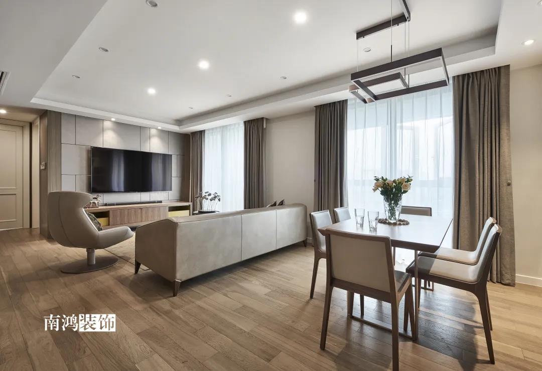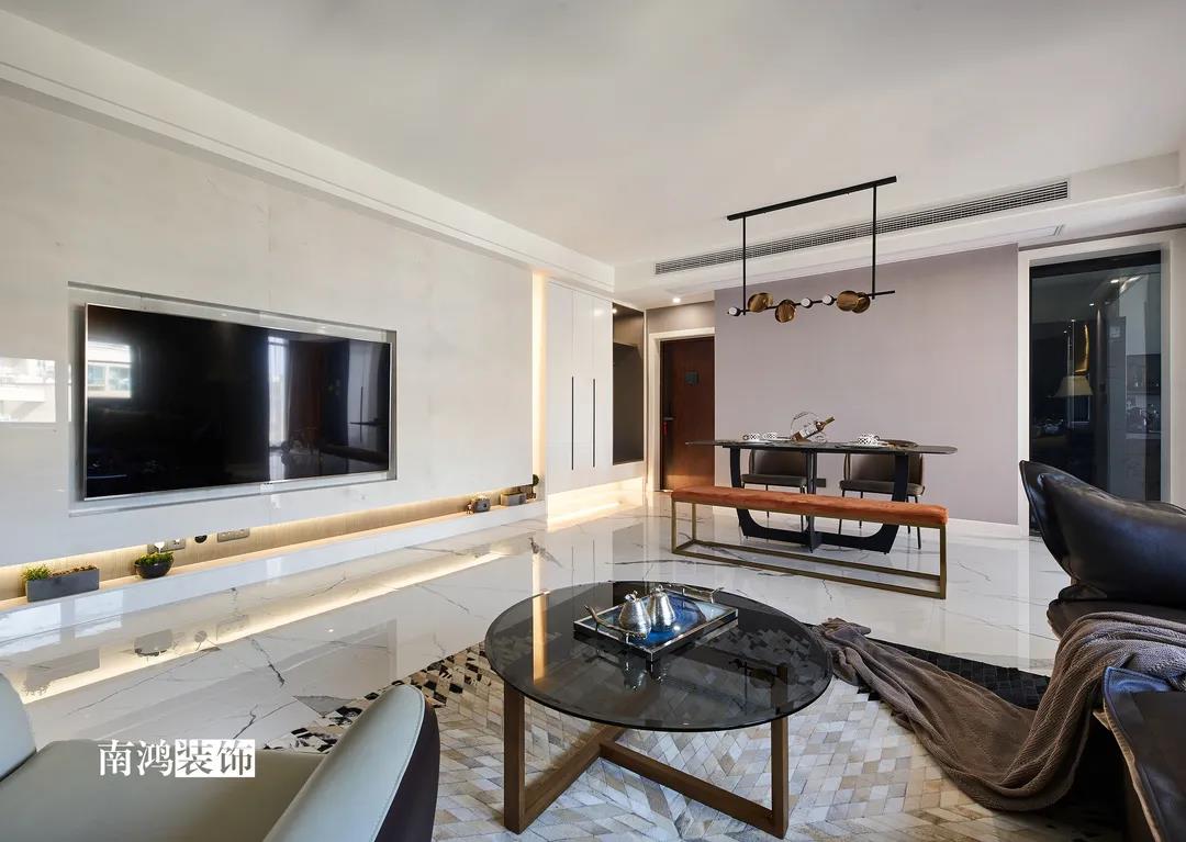 ▲客廳呈開(kāi)放式布局,家具間不同材質(zhì)的碰撞,打造輕盈時(shí)尚的生活環(huán)境。電視背景墻以地臺(tái)取代傳統(tǒng)電視柜,視覺(jué)效果統(tǒng)一大氣。