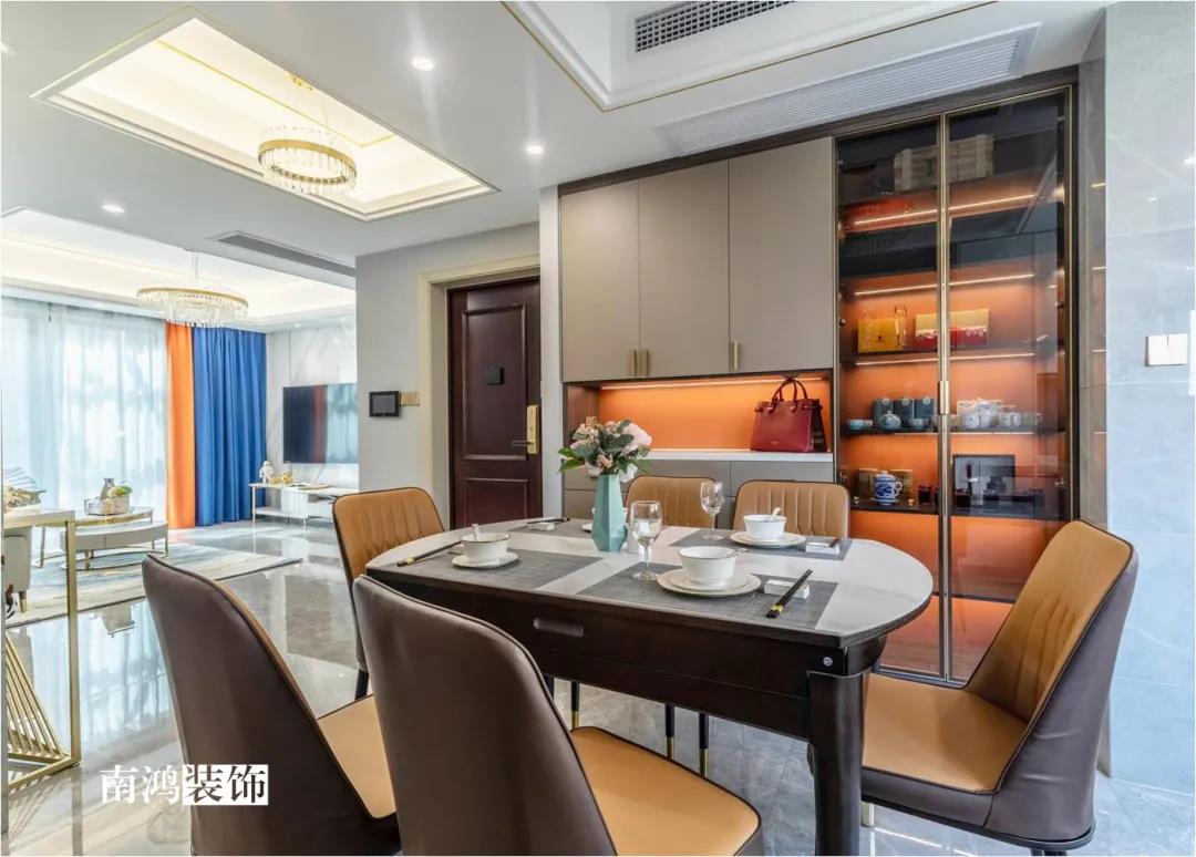 ▲餐廳與陽(yáng)臺(tái)相鄰,絨面的磚紅色長(zhǎng)凳和些許金色元素點(diǎn)綴出輕奢格調(diào)。