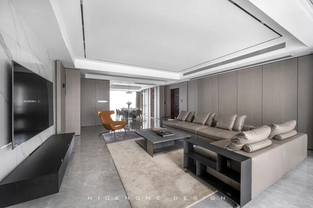 關于家的氛圍感營造,色彩和燈光是至關重要的兩點。 現代風格的色彩設計受現代繪畫流派思潮影響很大,通過強調原色之間的對比協調來追求一種具有普遍意義的永恒的藝術主題,裝飾畫、飾品的選擇對于整個色彩效果則起到錦上添花的作用。 除了色彩上的和諧配比,設計師在本案燈光設計上也下了許多功夫,重點突出:一是燈光功能布局的細化,照明燈光、背景燈光和藝術燈光三種效果有機組合;二是燈光控制的智能化、模式化,也即控制方式由分開的開關變為集中遙控,通過設定視聽、會客、餐飲、學習、睡眠等組合燈光模式,來達到理想效果。 客廳 LIVING ROOM 客廳包進陽臺,最大限度引入外部光線,呈現明亮通透的視覺效果。對于主人而言,室內的隱私也相當重要,因此在陽臺口安上了窗簾。 空間布局開敞,沙發后留出距離讓公區域動線更加流暢。硬裝與家具的線條都十分明晰,簡約的架構創造出清爽有序的居家環境。 質樸的木飾面相比其他材質而言要更加低調,顯露出不張揚的高級感。與之呼應的暖咖色皮藝沙發搭配絨布拼色地毯,和諧的色調、統一的氣質,多種材質交織,賦予空間自然的呼吸與舒緩的心跳。 陽臺一側的立面空間不做絲毫浪費,收納柜中嵌入了洗手臺和直飲水機,視覺上渾然一體。 餐廳 DINING ROOM “是誰來自山川湖海,卻囿于晝夜,廚房與愛。”時尚利落的現代感在餐廳空間鋪展開來,散落于細節間的精致能輕松勾起用餐者的食欲。 餐廳與廚房以長長的玻璃移門相隔,空間視野相當開闊,移門一開,餐廚互動便沒了阻礙。 大理石紋的餐桌組合不銹鋼桌腳,圓角設計勾勒著藝術感知。背景做整墻柜體,除了收納餐具、酒品之外,也方便展示一些個性單品。 廚房 KITCHEN L型布局廚房,有足夠的操作臺讓主人大展廚藝,白色系能將空間寬敞明亮的感覺放大到極致。 過道 CORRIDOR 過道,統一的原木色讓視覺保持極致簡潔,盡頭處的燈光打下來,讓墻上的藝術畫作成功凝固住了剎那間的美好。 臥室 BEDROOM 主臥的陽臺也包進室內,頓時有種面積擴大了兩倍的感覺,更大的面積也意味著更多的活動空間與收納空間。 房間過大容易顯得空蕩蕩的,因此我們在床尾設置了床尾凳和地毯,用以豐富視覺與功能性,頂部依然是簡練的無主燈設計。 睡眠區域簡潔沉穩,高級灰色調與深木色有助于營造安靜而放松的休憩氛圍。 休閑陽臺位置擺放經典的Togo沙發,松松軟軟的坐感簡直不要太舒服! 書房 STUDY 一間高品質的書房背后,必定有著一顆熱愛學習用心工作的靈魂。厚實的桌體組合纖細的桌腳,書桌給人的設計感很強,搭配吊燈和地毯,進一步勾勒出空間的格調與優雅。 休閑室 LEISURE ROOM 家里的休閑室,延續了公區域大面積的灰色質感元素,地臺+懶人沙發+電視,在這里可以自由自在地做自己想做的任何事! 衛生間 BATHROOM 主衛面積富余,在淋浴間和浴缸之外還留出了大量走動空間,再加上雙臺盆設計,力求將舒適度拉到最大。 公衛與次衛,空間分別用灰色與白色的瓷磚統一鋪就,干凈整潔,白凈的基底疊加上黑色線條,看上去會更有品質且視覺不再單一。