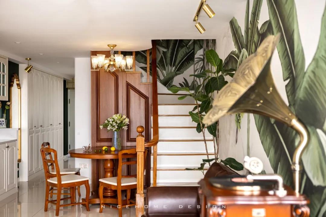 玄關3米長的鞋柜區延伸進來至樓梯下的餐廳空間,餐邊柜長約2米3,墻面鋪貼彩色孔雀羽瓷磚,清新又顯活力。棕櫚樹背景一路鋪展上樓梯,成為本案一大亮點。