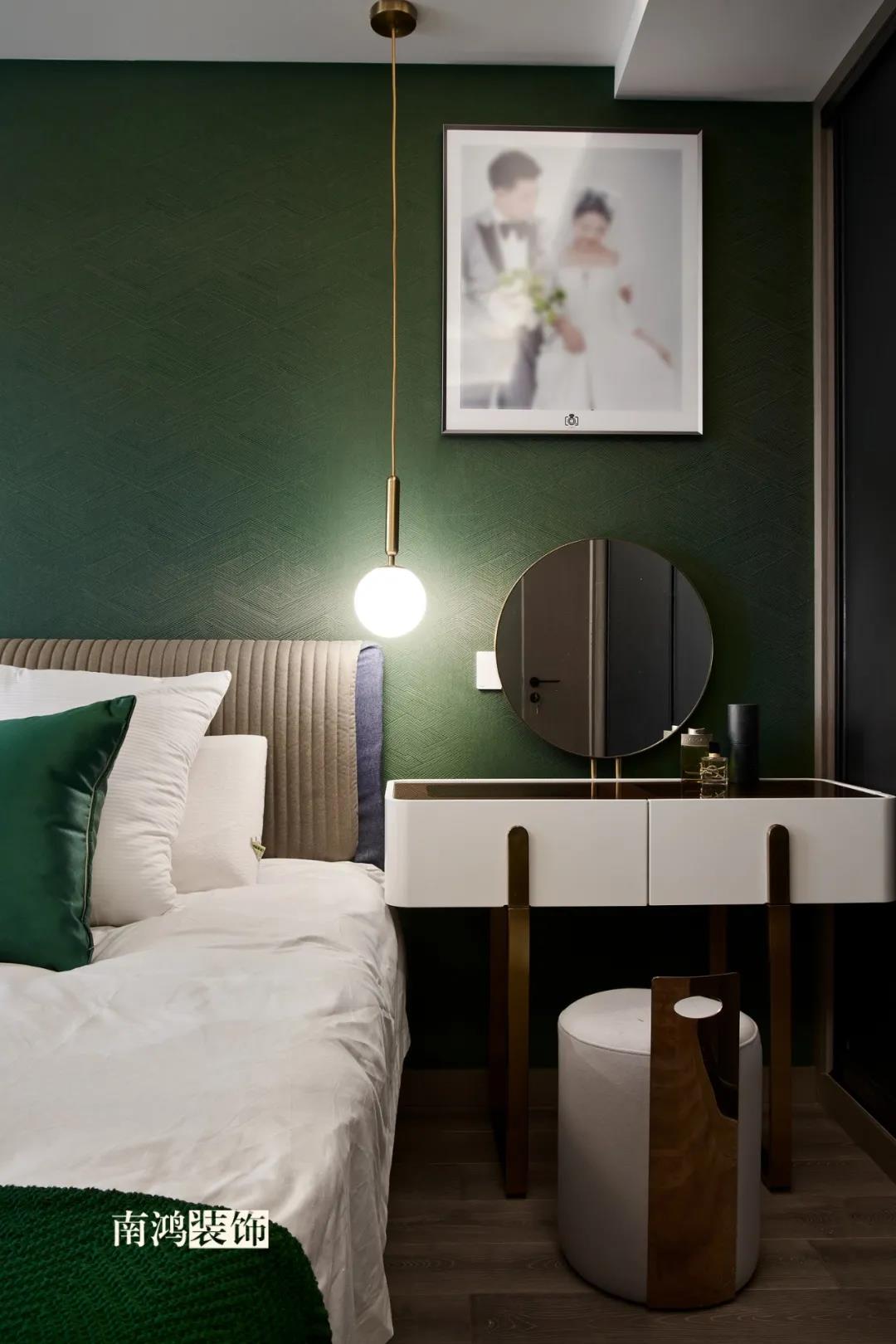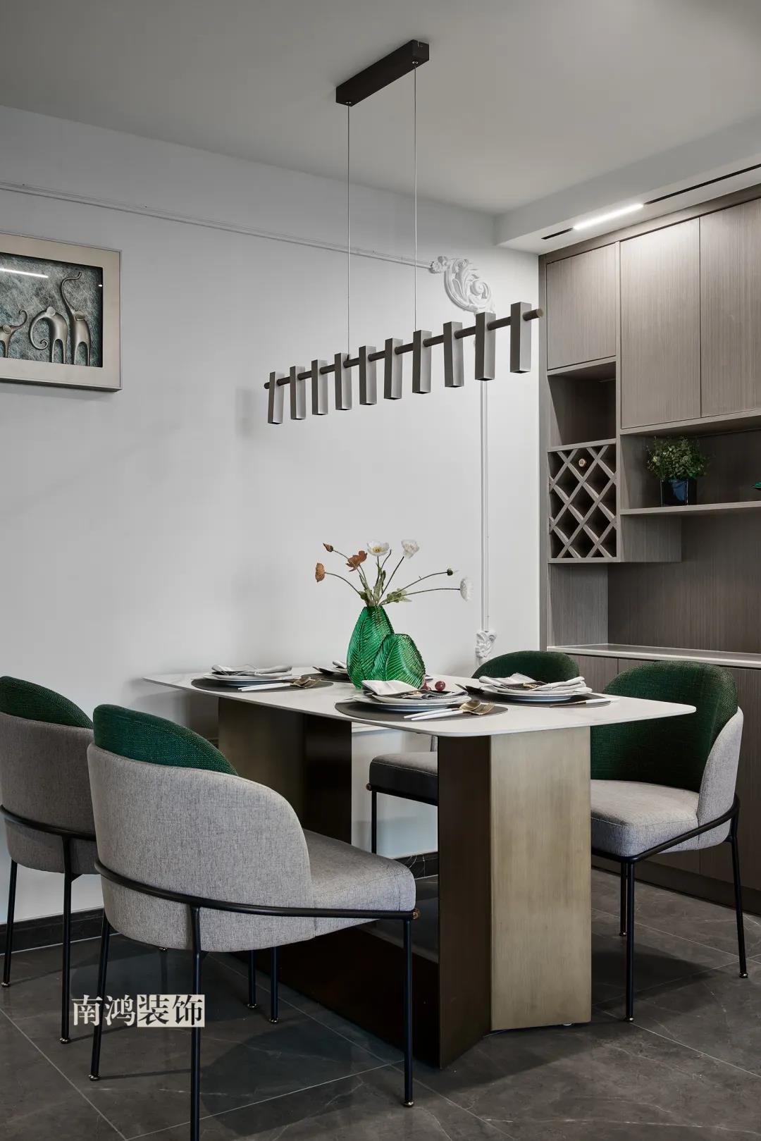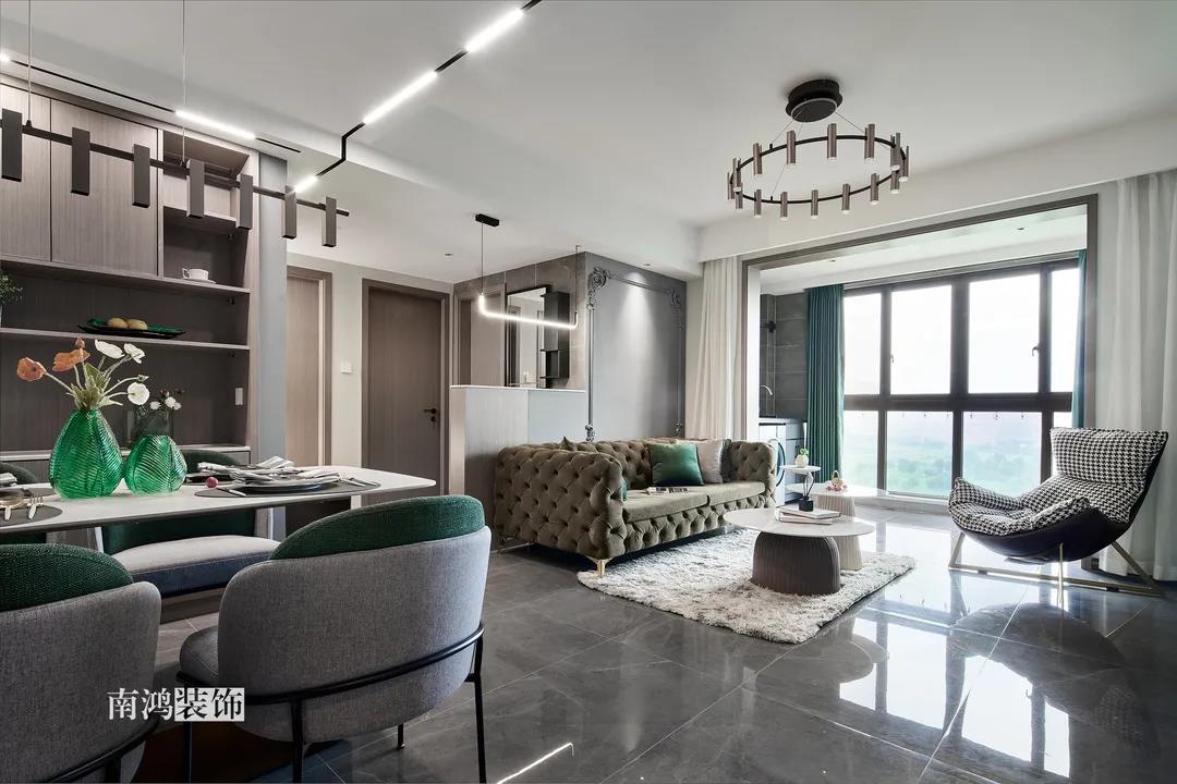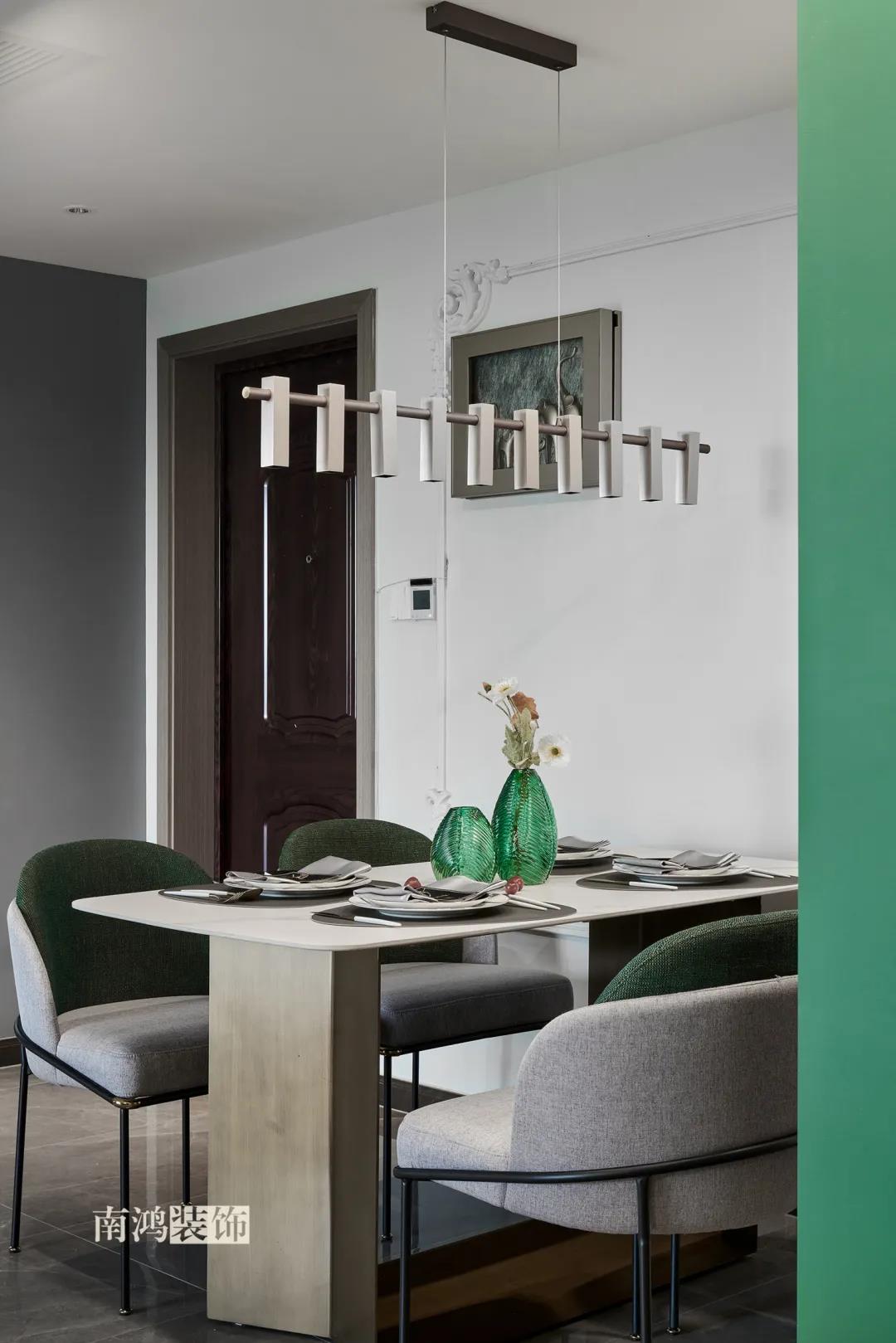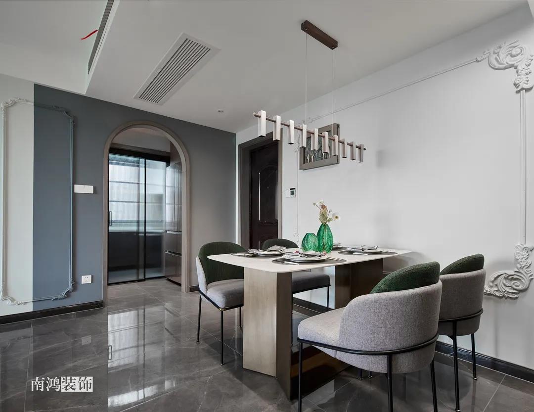 【項(xiàng)目·信息】 地址 / 世貿(mào)西西湖 戶(hù)型 / 三室兩廳 面積 / 91㎡ 風(fēng)格 / 現(xiàn)代法式 設(shè)計(jì)施工 / 浙江南鴻裝飾 本案為91㎡現(xiàn)代法式風(fēng)格作品。現(xiàn)代法式摒棄傳統(tǒng)法式繁復(fù)、冗雜的裝飾造型與甜膩的色澤,通過(guò)淡雅的色調(diào),簡(jiǎn)潔的幾何線條和典雅時(shí)尚的陳設(shè)軟裝,來(lái)打造更符合現(xiàn)代人喜好的生活空間。 業(yè)主夫妻倆,一位是性格沉悶的工程男,一位是熱情開(kāi)朗的設(shè)計(jì)女,彼此志趣相投,性格互補(bǔ),優(yōu)雅的法式,給這個(gè)甜蜜小家庭增添了更多美妙情趣~ ▲原始結(jié)構(gòu)圖 ▲平面設(shè)計(jì)圖 ①衛(wèi)生間做干濕分離。 ②兒童房的門(mén)洞方向更改,完整電視背景墻效果。 ③主臥和次臥交換位置,次臥陽(yáng)臺(tái)打通。 ④縮小主衛(wèi)面積,墻體后退得以嵌入一個(gè)大衣柜。 入戶(hù)門(mén)進(jìn)來(lái)即見(jiàn)餐廳。戶(hù)型面積不大,公區(qū)域都盡量打開(kāi)讓視野更開(kāi)闊。 硬裝整體簡(jiǎn)潔,墻面可見(jiàn)石膏線花紋裝飾,借此強(qiáng)化一定法式空間意象。餐桌椅、吊燈的造型選擇也都偏現(xiàn)代,空間中奢與簡(jiǎn)的分寸把握得恰到好處。 綠色作為本案的點(diǎn)綴色,可以說(shuō)貫穿了幾乎各個(gè)分區(qū)之中,鮮活的生命力讓人過(guò)目難忘。 客餐廳一體式設(shè)計(jì)是小戶(hù)型的常見(jiàn)選擇,也更符合現(xiàn)代人的生活習(xí)慣。灰白主色保持整體低調(diào),局部墻面以飽和度高的綠色乳膠漆涂刷,空間被提亮不少。 客廳采光良好,沙發(fā)背景墻連接干區(qū)的位置做一個(gè)小的半高柜,提升空間利用率。軟裝家具布置則用簡(jiǎn)潔的設(shè)計(jì)手法將法式的古典優(yōu)雅和現(xiàn)代的簡(jiǎn)約時(shí)尚相結(jié)合,使得空間既有休閑感受,又不乏藝術(shù)氣息。 經(jīng)過(guò)設(shè)計(jì)調(diào)整,電視背景墻的效果更加完整,深淺色調(diào)做左右兩塊分界,以石膏線裝飾則更顯精致。 拱形門(mén)洞也被應(yīng)用在這里,作為歷史悠遠(yuǎn)的一種經(jīng)典建筑元素,本身就很契合各種帶古典意味的家居風(fēng)格。 廚房以長(zhǎng)虹玻璃門(mén)隔絕油煙,保證內(nèi)部的私密性,也實(shí)現(xiàn)了采光的通透感。冰箱被移至過(guò)道,釋放內(nèi)部更多空間。 廚房采用U型布局,動(dòng)線流暢,烹飪區(qū)、操作臺(tái)和洗滌區(qū)都有各自獨(dú)立的空間,互不打擾。 主臥,青草綠墻布做背景裝飾,留白保持簡(jiǎn)約調(diào)性,一幅婚紗照訴說(shuō)著夫妻二人簡(jiǎn)簡(jiǎn)單單、明明白白的甜蜜愛(ài)情故事。 光源除主燈外,床頭兩側(cè)各有布置,一邊長(zhǎng)臂燈一邊吊燈的不對(duì)稱(chēng)設(shè)計(jì),讓臥室空間顯得更加有趣,金屬材質(zhì)呈現(xiàn)輕奢美感。 長(zhǎng)輩房的背景、色彩選擇需要貼合老人的喜好,選用橙色主色,帶來(lái)如陽(yáng)光般的燦爛、溫暖感受。 夫妻二人目前還沒(méi)有孩子,這個(gè)房間預(yù)備做以后的兒童房,布置相對(duì)簡(jiǎn)單,方便將來(lái)調(diào)整。 衛(wèi)生間將干濕區(qū)域分離,洗漱臺(tái)盆柜、壁柜與旁邊打造出的半高柜體可將瓶瓶罐罐都收入其中,保證視覺(jué)上的清爽。