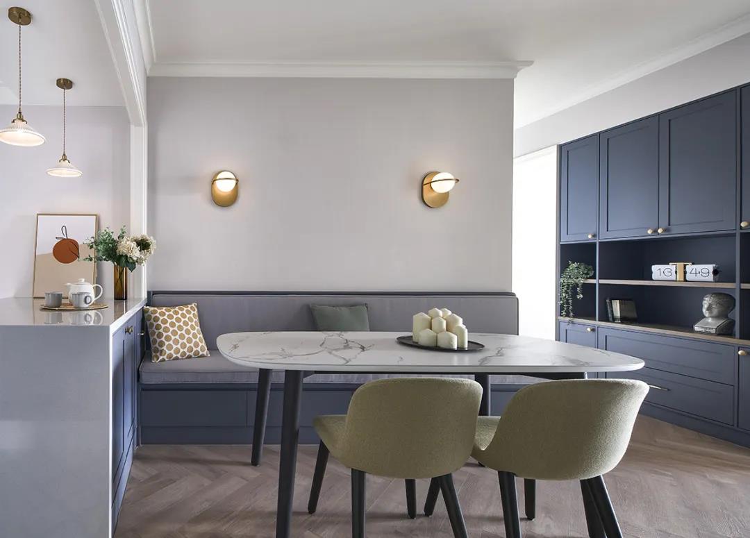 卡座設計具有節(jié)省空間和提供收納的雙重功用。卡座一般都是貼墻,只需留出一邊過道就行,而且卡座可以結(jié)合收納柜,使得餐廳的收納能力大大提高。